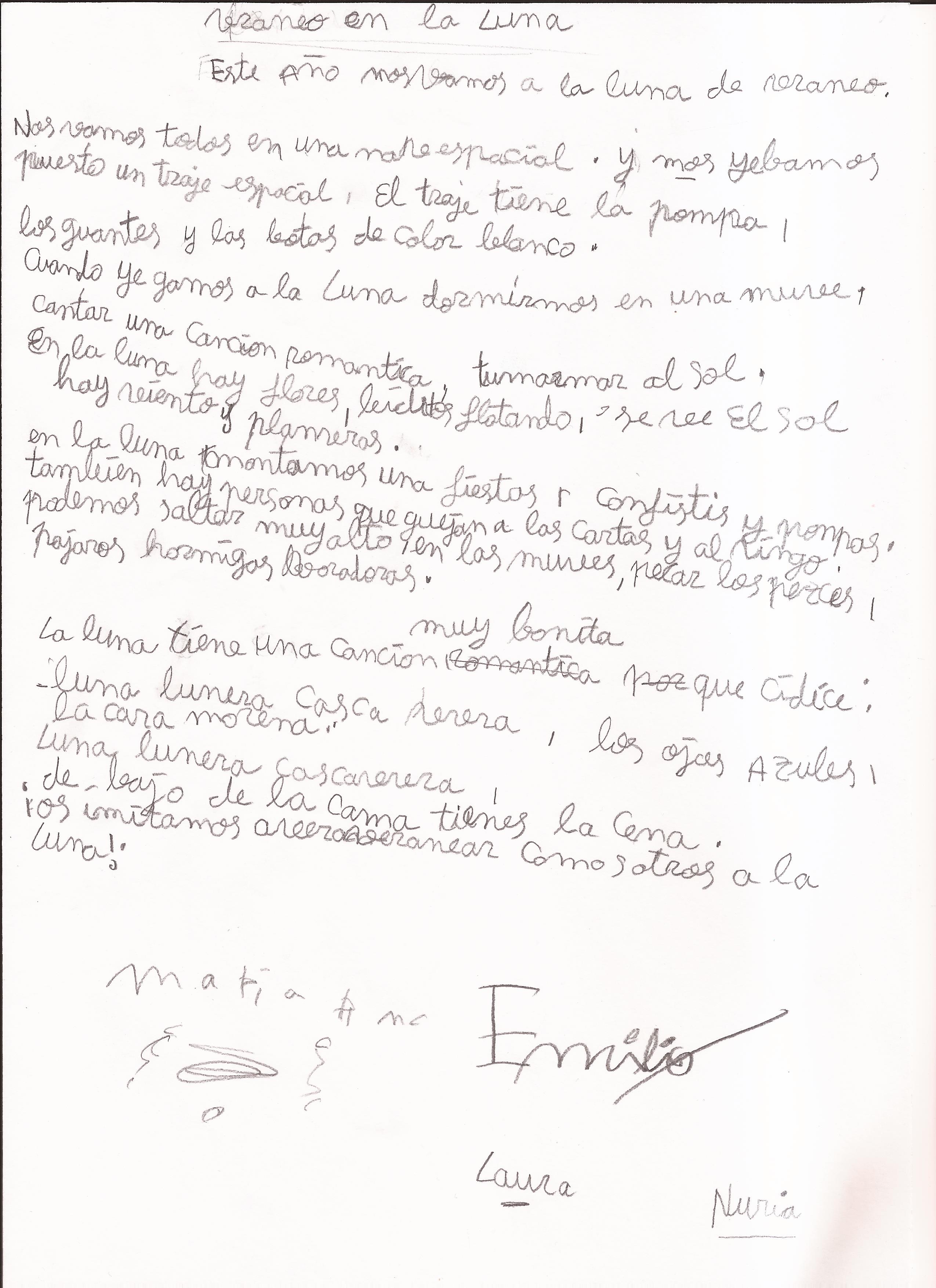 Este año nos vamos a la luna de veraneo. Nos vamos todos en una nave espacial. Y llevamos puesto un traje espacial, el traje tiene una pompa, guantes y las botas blancas.