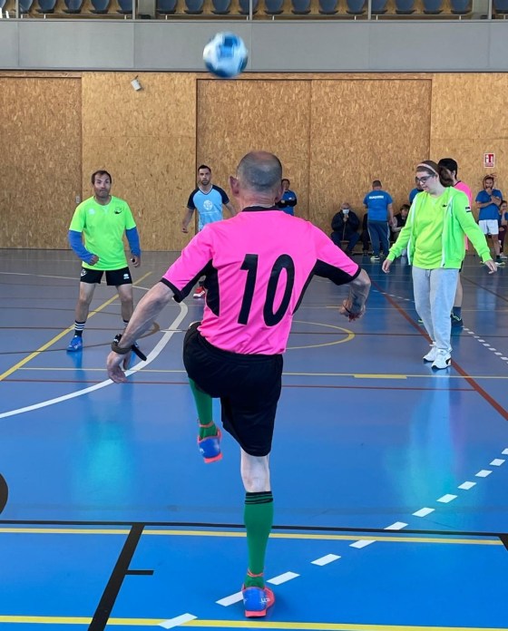 AFIM pelea por la posesión del balón, ataca acercándose con decisión hacia la portería de Salud Mental. No se lo piensa dos veces, chuta y…¡Menudo golazo!